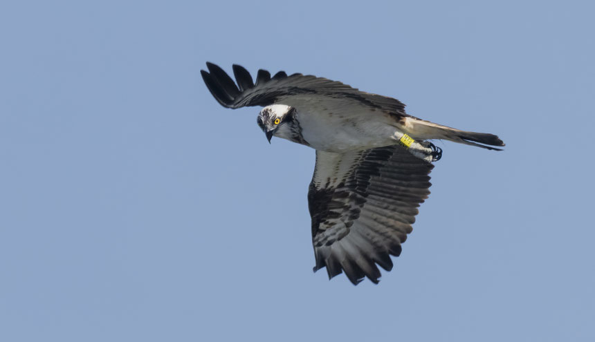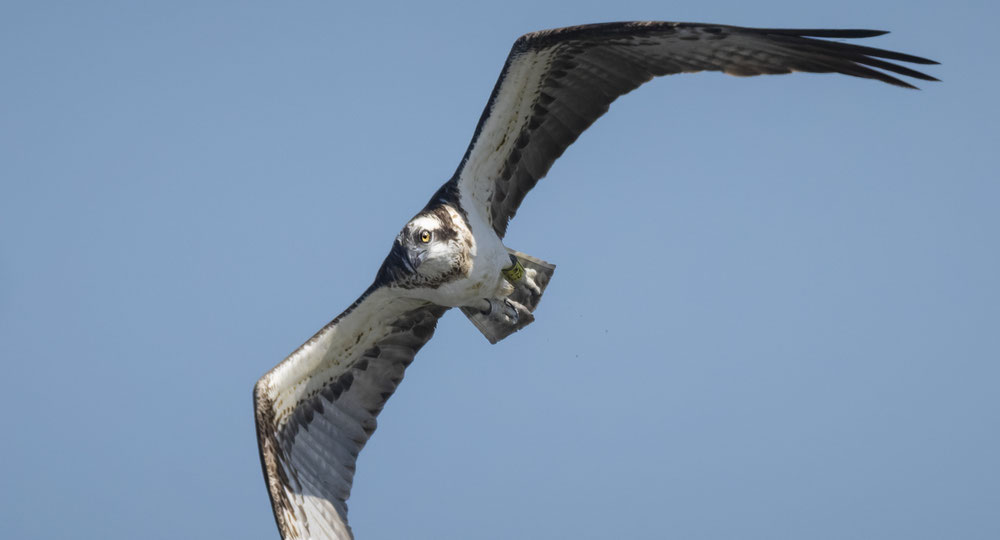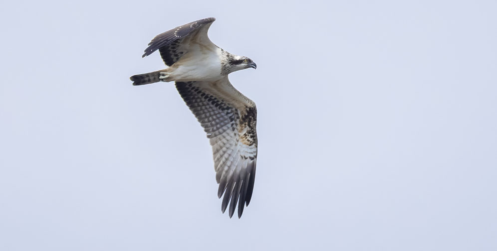 Auf Durchzug befinden sich Fischadler hier vor dem Turm an der Hirschauer Bucht am Chiemsee.
