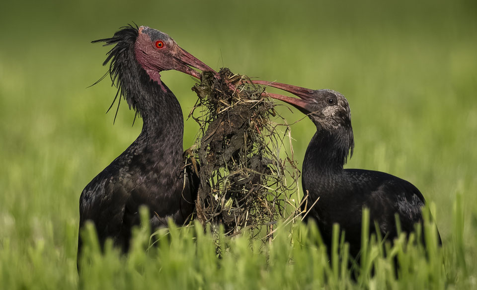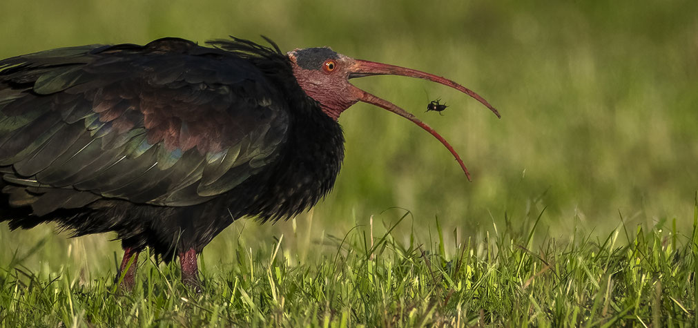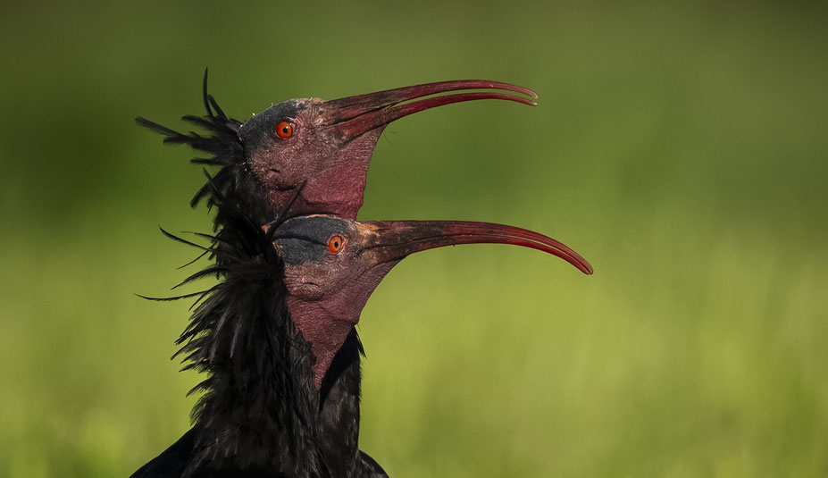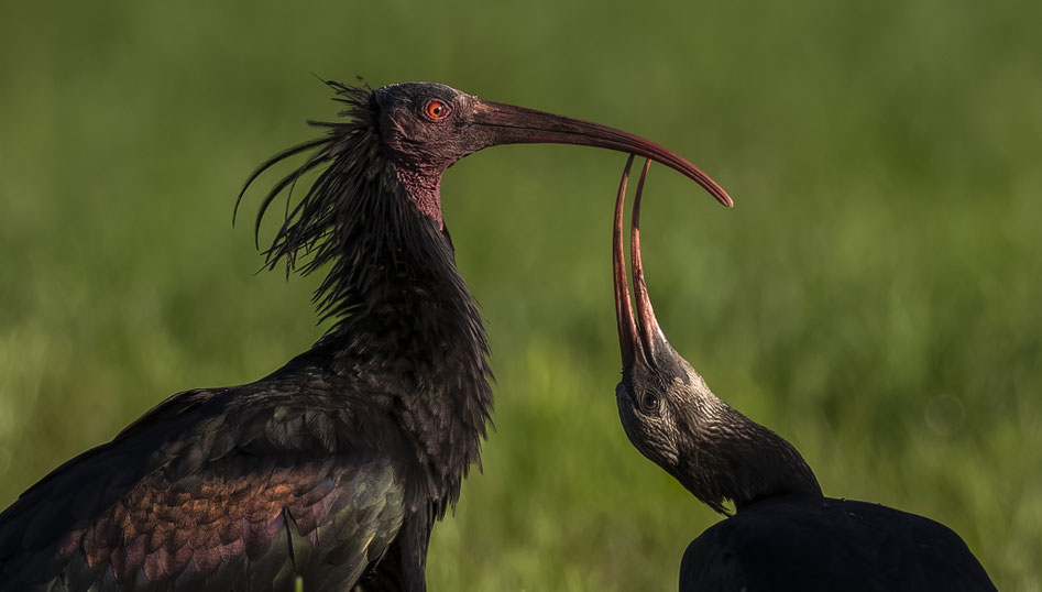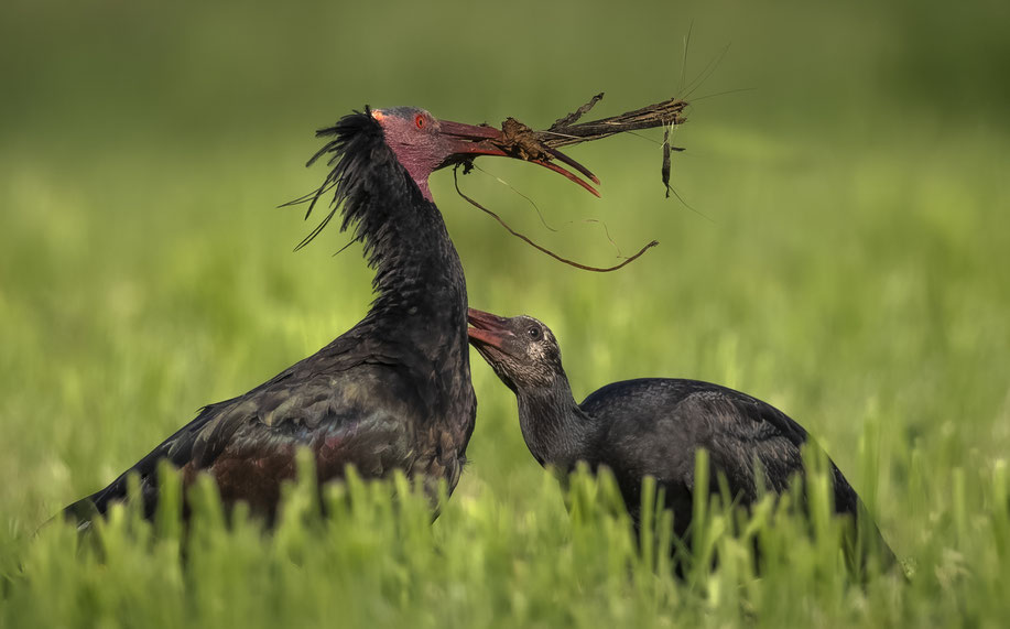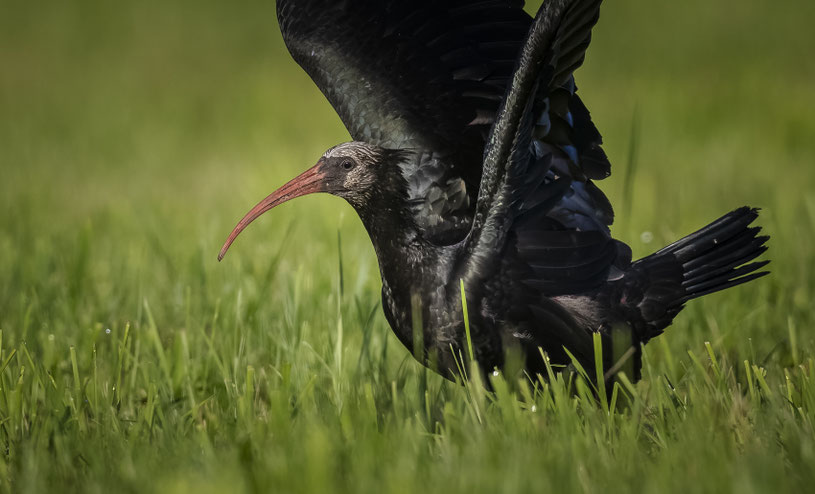 Unbekümmert spielen hier Waldrappen im österreichischen Raum auf der Wiese.