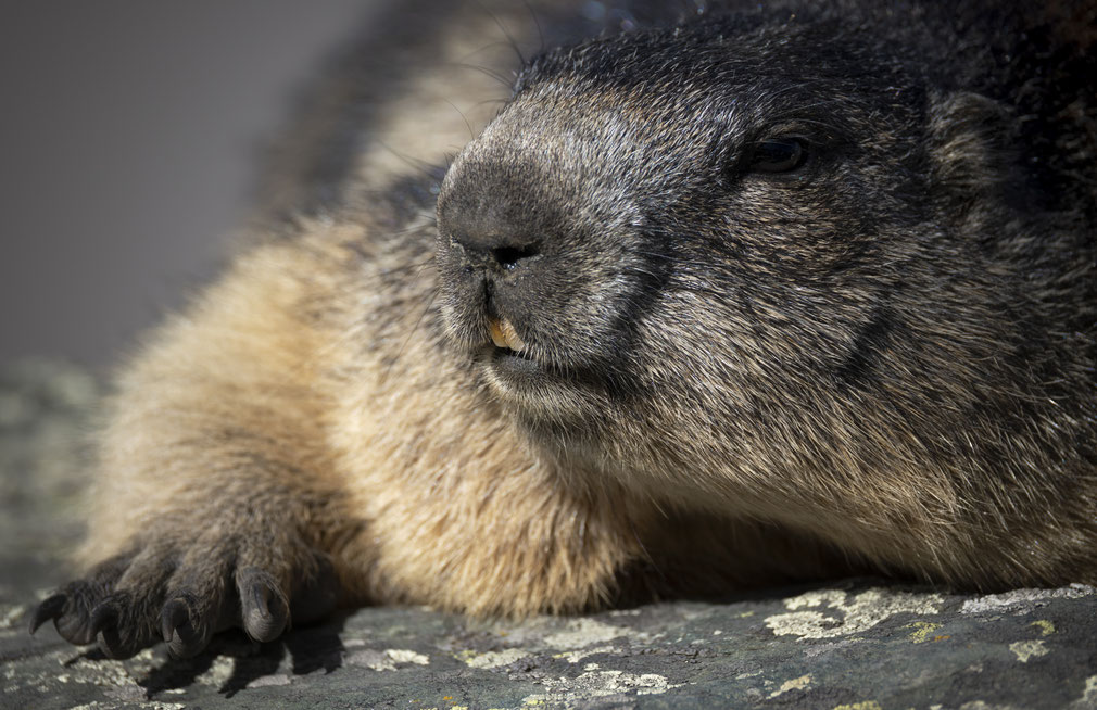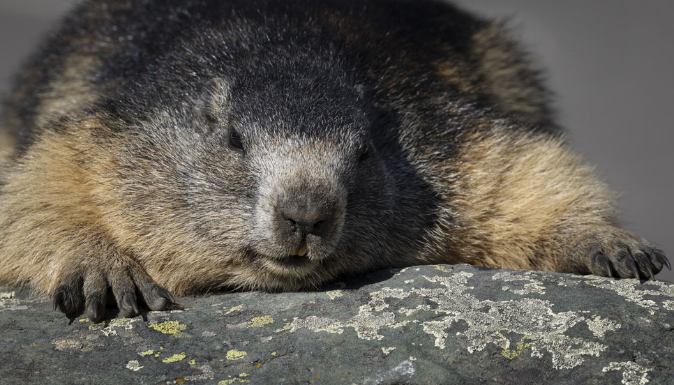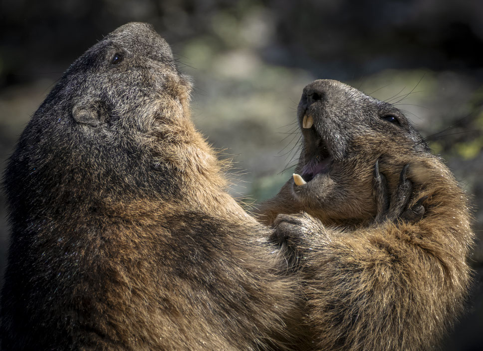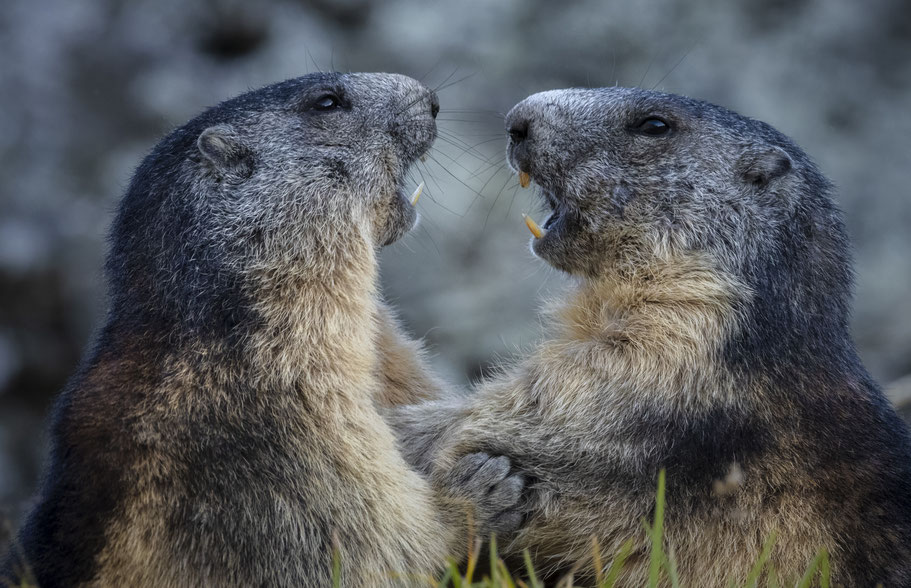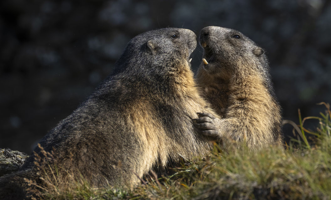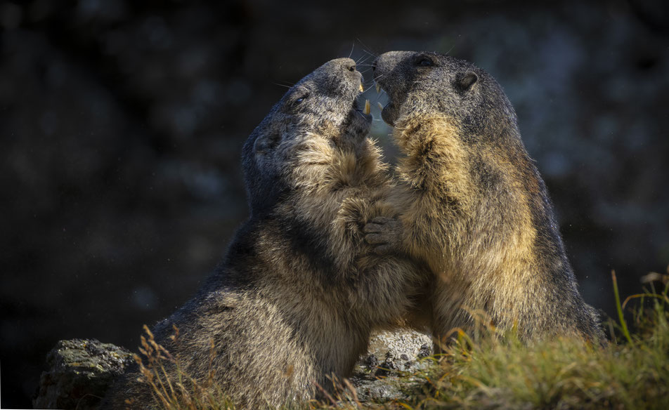 Sichtlich Spaß hat die Murmeltierfamilie hier am frühen Morgen des hereinbrechenden Tages