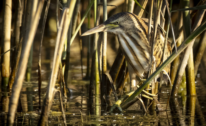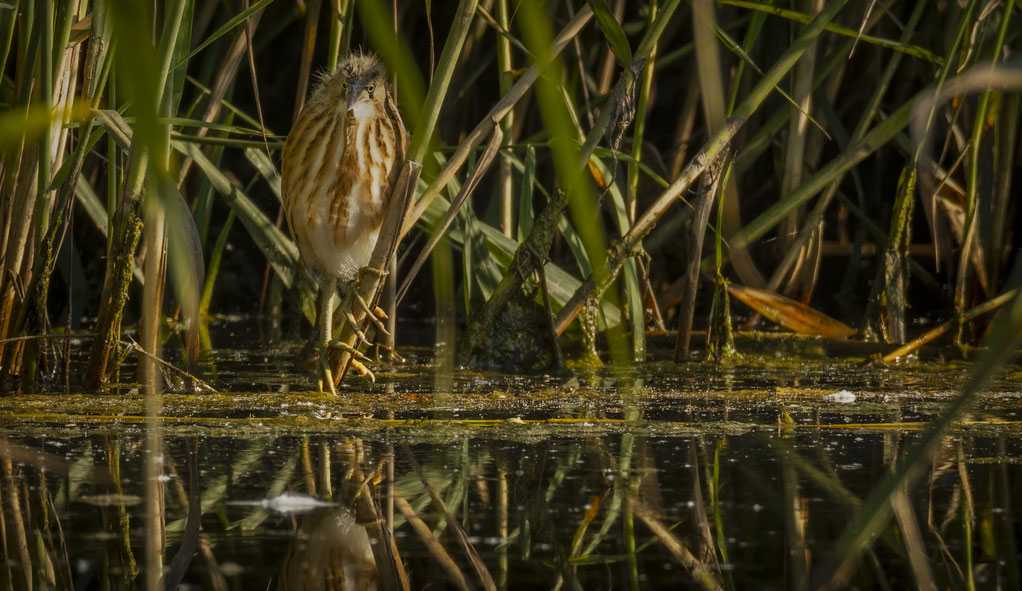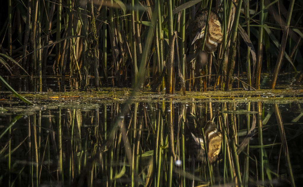 Nur kurz treten die scheuen Zwergdommeln aus dem Schilfgürtel hervor und zeigen sich.