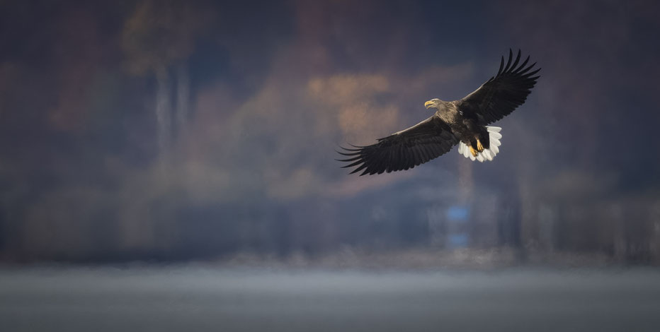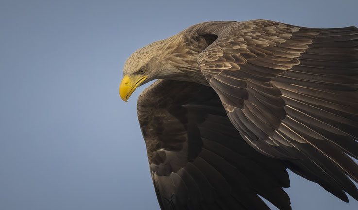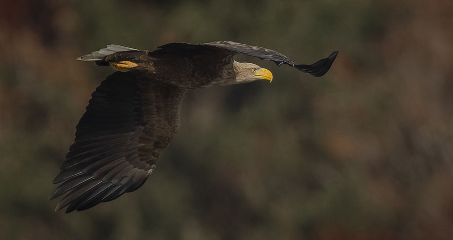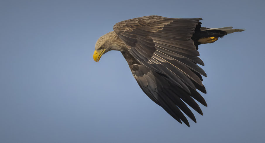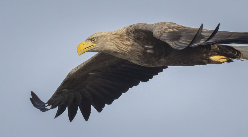 Auf seiner Jagd zeigt sich das Seeadlermännchen bisweilen sehr nah im Vorbeiflug . . .